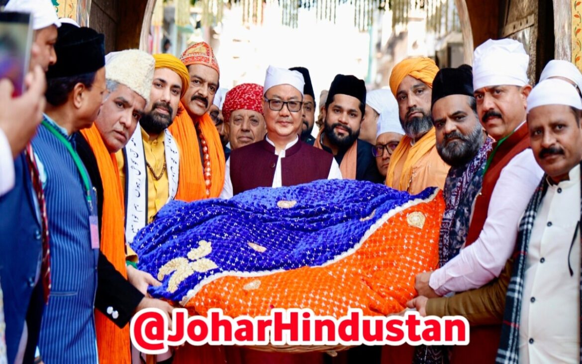 जोहार हिंदुस्तान | अजमेर/राजस्थान: शहंशाह-ए-हिंद हज़रत ख़्वाजा मोइनुद्दीन चिश्ती (रह.) के 814वें सालाना उर्स के पावन अवसर पर प्रधानमंत्री नरेंद्र मोदी की ओर से सोमवार, 22 दिसंबर 2025 को अजमेर शरीफ दरगाह में चादरपोशी की गई। प्रधानमंत्री के प्रतिनिधि के रूप में केंद्रीय मंत्री किरेन रिजिजू अजमेर पहुंचे और दरगाह में चादर चढ़ाकर देशवासियों की ओर से अमन, शांति और खुशहाली की दुआ की।