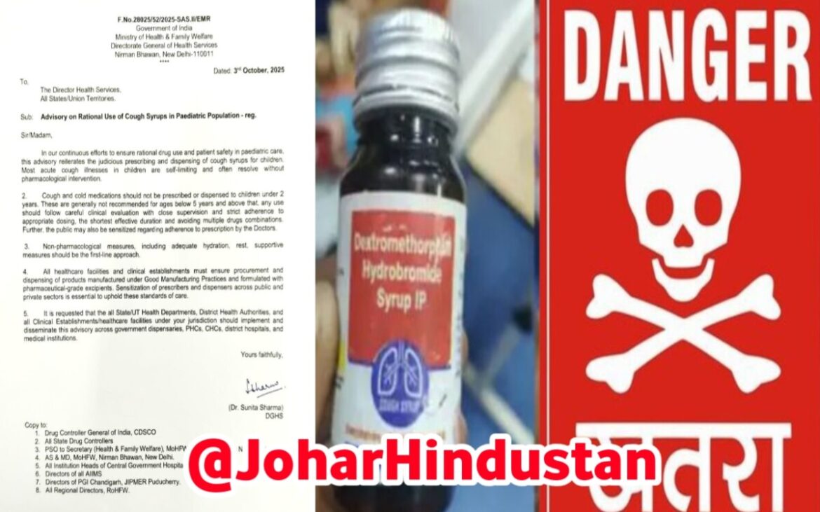 जोहार हिंदुस्तान | नई दिल्ली : हाल ही में देश के कई हिस्सों से खांसी-सिरप पीने के बाद बच्चों की मौत की चौंकाने वाली घटनाएं सामने आई हैं। मध्य प्रदेश और राजस्थान में अब तक करीब दर्जनभर मासूमों की मौत संदिग्ध खांसी-सिरप सेवन से हो चुकी है। इन घटनाओं ने केंद्र और राज्य सरकारों को अलर्ट कर दिया है।