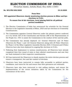 चुनाव आयोग ने आधिकारिक प्रेस नोट जारी कर बताया कि पहले चरण के लिए 121 जनरल ऑब्जर्वर और 18 पुलिस ऑब्जर्वर तैनात वही दूसरे चरण में 122 जनरल ऑब्जर्वर और 20 पुलिस ऑब्जर्वर होंगे तैनात किए गए हैं। जबकि 8 विधानसभा उपचुनावों में भी 8 जनरल ऑब्जर्वर और 8 पुलिस ऑब्जर्वर की विशेष तैनाती की गई हैसभी पर्यवेक्षकों को निर्देश दिया गया है कि वे अपने-अपने प्रभार क्षेत्रों में फील्ड विजिट करें और बूथ स्तर तक निगरानी रखें।