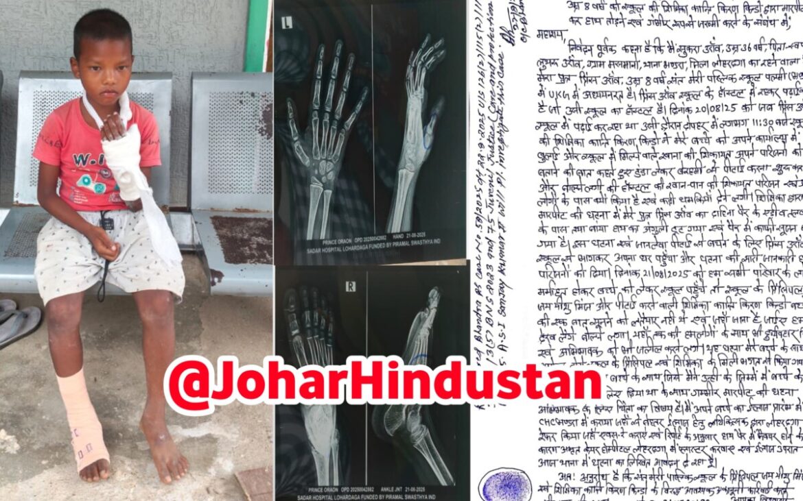 जोहार हिंदुस्तान | लोहरदगा : झारखंड के लोहरदगा जिले से एक दिल दहला देने वाली घटना सामने आई है। भंडरा थाना क्षेत्र के मसमानो गांव निवासी सुकरा उरांव का 8 वर्षीय पुत्र प्रिंस उरांव (छात्र – यूकेजी, सेंट मेरी पब्लिक स्कूल, पलमी) के साथ स्कूल की शिक्षिका द्वारा बेरहमी से मारपीट करने का मामला प्रकाश में आया है। घटना में बच्चे का हाथ-पैर टूट गया। परिजनों की शिकायत पर भंडरा थाना पुलिस ने शिक्षिका और स्कूल प्रिंसिपल के खिलाफ गंभीर धाराओं में एफआईआर दर्ज कर ली है।