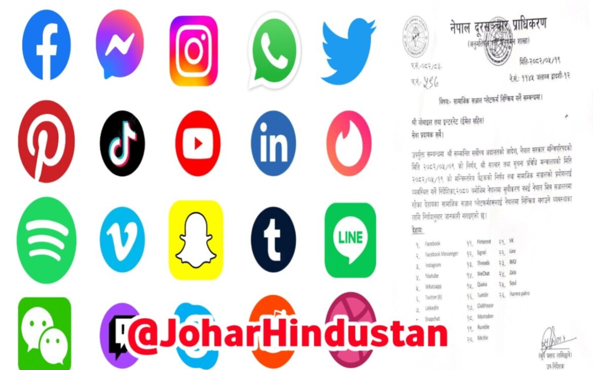 जोहार हिंदुस्तान डेस्क | नई दिल्ली : नेपाल सरकार ने सोशल मीडिया प्लेटफॉर्म्स पर कड़ा कदम उठाते हुए एक साथ 26 प्रमुख सोशल मीडिया एप्स और वेबसाइट्स को देश में प्रतिबंधित करने का आदेश जारी किया है। नेपाल दूरसंचार प्राधिकरण (NTA) ने यह आदेश 19 अगस्त 2024 को सूचना एवं प्रसारण मंत्रालय के निर्देश और माननीय सर्वोच्च अदालत के आदेश के अनुपालन में जारी किया।