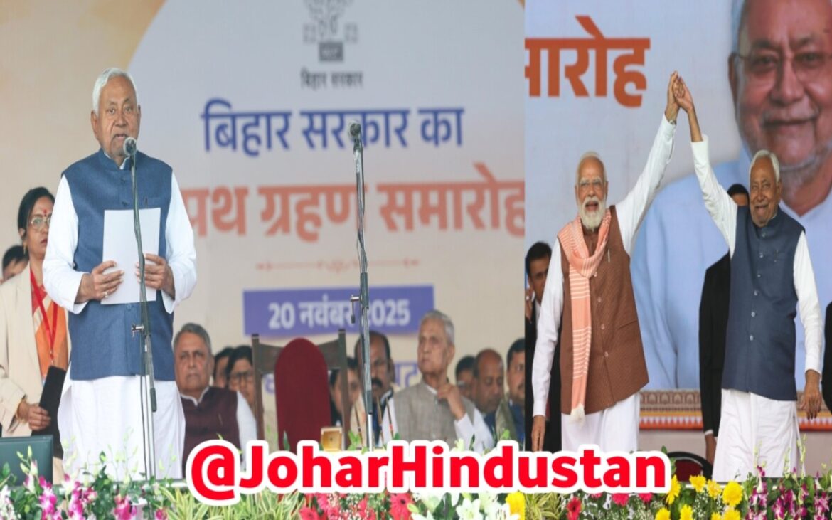 जोहार हिंदुस्तान | पटना: बिहार में ऐतिहासिक राजनीतिक क्षण देखने को मिला, जब नीतीश कुमार ने 20 नवंबर 2025 को 10वीं बार मुख्यमंत्री पद की शपथ ली। पटना के गांधी मैदान में आयोजित भव्य समारोह में प्रधानमंत्री नरेंद्र मोदी, गृह मंत्री अमित शाह, बीजेपी राष्ट्रीय अध्यक्ष सहित NDA के तमाम बड़े नेता मौजूद रहे।