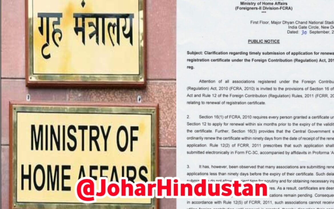 जोहार हिंदुस्तान | नई दिल्ली : भारत सरकार के गृह मंत्रालय ने विदेशी अंशदान (विनियमन) अधिनियम, 2010 (FCRA) के तहत पंजीकृत सभी गैर-सरकारी संगठनों (NGOs) और एसोसिएशनों को सख्त निर्देश जारी किए हैं। मंत्रालय ने स्पष्ट कर दिया है कि अब संगठनों को अपने पंजीकरण के नवीनीकरण का आवेदन समाप्ति तिथि से कम से कम चार महीने पहले अनिवार्य रूप से जमा करना होगा।