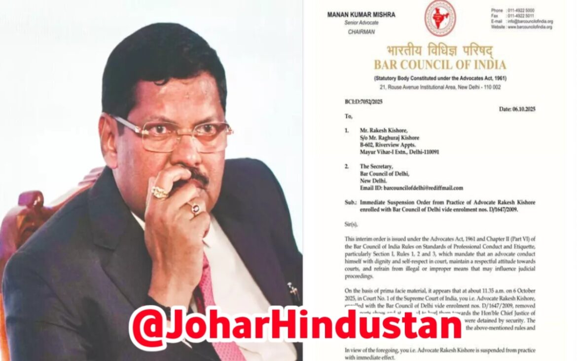 जोहार हिंदुस्तान | नई दिल्ली: सुप्रीम कोर्ट में देश के मुख्य न्यायाधीश (CJI) जस्टिस डी. वाय. गवई पर जूता फेंकने की कोशिश करने वाले वकील राकेश किशोर पर बार काउंसिल ऑफ इंडिया (BCI) ने कड़ी कार्रवाई की है। बार काउंसिल ने उनका वकालत करने का लाइसेंस तत्काल प्रभाव से निलंबित (Suspended) कर दिया है।